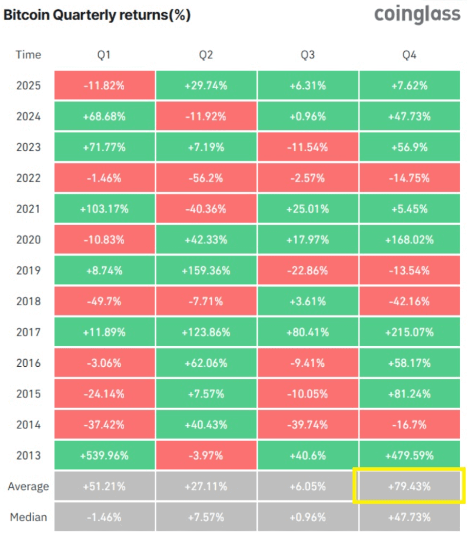 Looking at Bitcoin’s historical seasonality, Q4 consistently stands out. Over the past decade, it has delivered the highest average return of any quarter, with an average gain of approximately 79.5%.