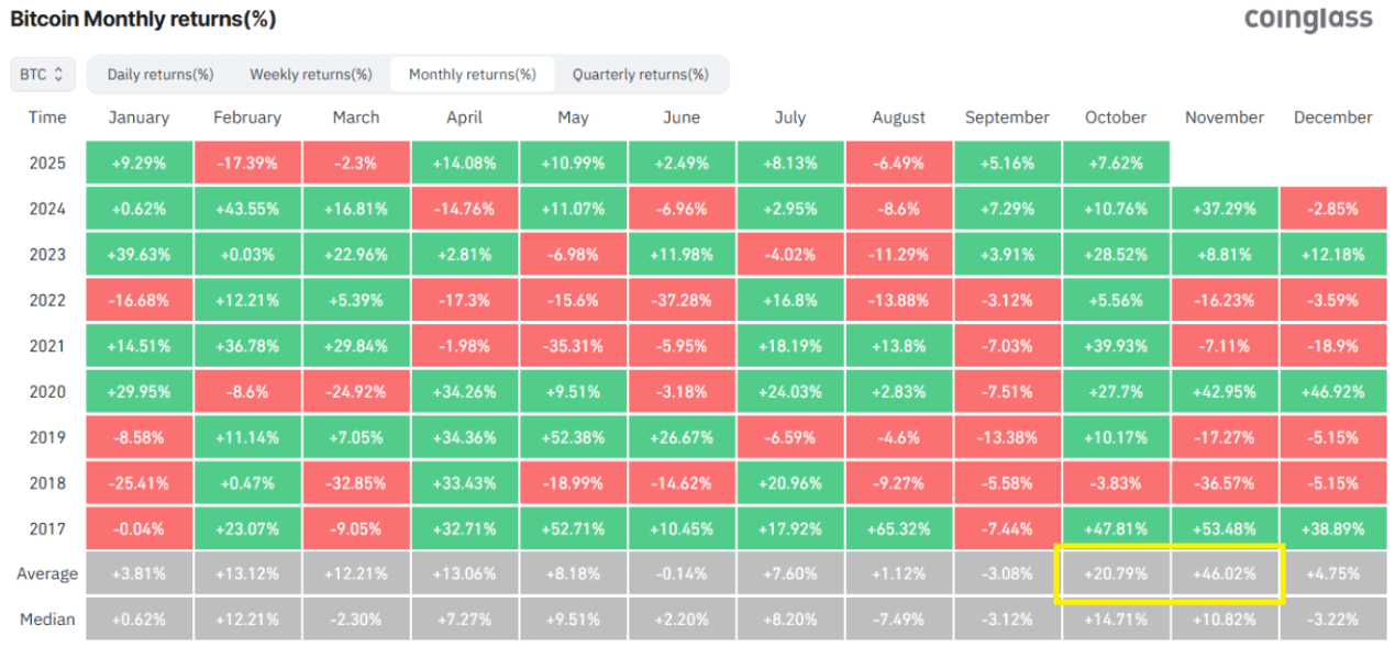 Historical data shows that October and November are by a significant margin the best return months for Bitcoin