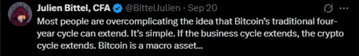 Others argue that Bitcoin is now more tied to global economic conditions than its internal supply schedule. From this perspective, the cycle could extend into 2026, depending on how things unfold globally.