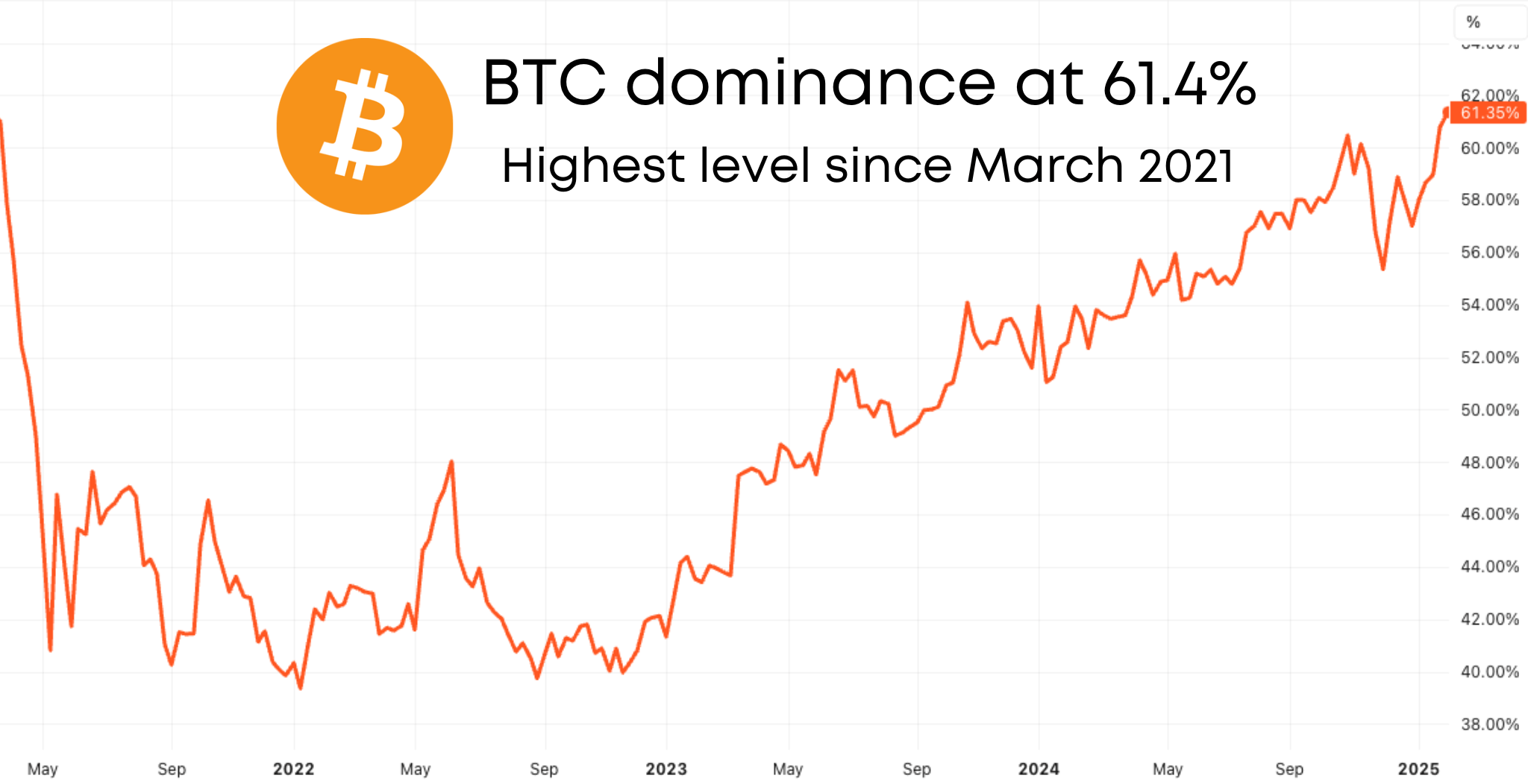 Bitcoin dominance—which measures BTC’s market cap as a percentage of the combined market cap of all cryptocurrencies—hit 61.4% this week, its highest level since March 2021. The reasons behind the recent climb in BTC dominance are multi-faceted. One major reason is MicroStrategy’s continued accumulation of BTC. In the past few months, it has spent several billions of dollars adding to its BTC holdings. The company, co-founded by Michael Saylor, recently announced plans to keep accumulating.